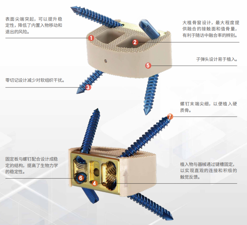 Features: The lumbar self-stabilizing interbody fusion cage is a hollow rectangular fusion device mounted on a titanium alloy plate, with tantalum markers attached. It is used for vertebral body fusion and is available in multiple models with varying heights, surface areas, and lordotic angles to accommodate the anatomical differences among different patients.