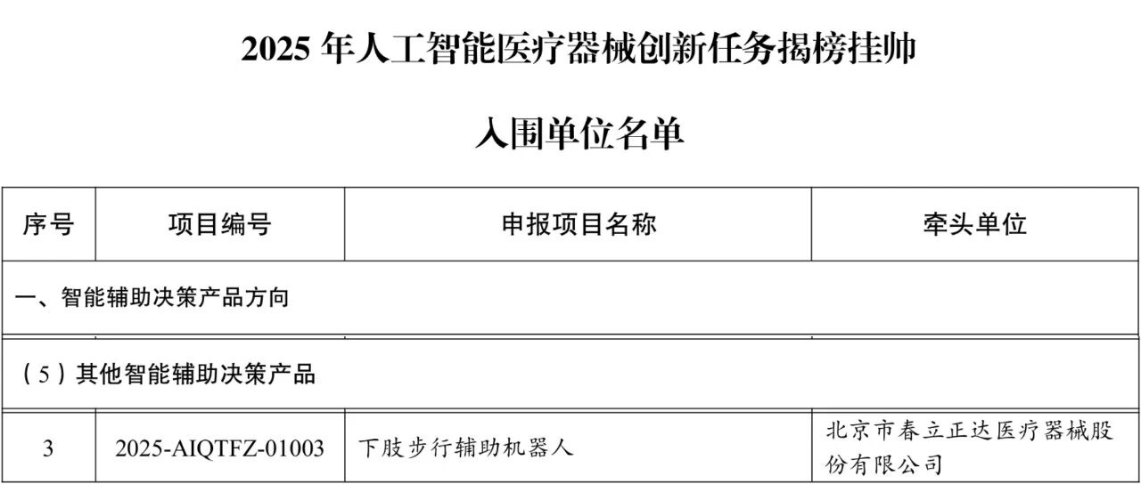 按照《工业和信息化部办公厅 国家药品监督管理局综合和规划财务司关于开展2025年人工智能医疗器械创新任务揭榜挂帅工作的通知》(工信厅联科函〔2025〕30号),经各地推荐、综合评审和网上公示,2025年人工智能医疗器械创新任务揭榜挂帅入围名单已于1月5日正式确定。北京市春立正达医疗器械股份有限公司凭借“下肢步行辅助机器人”项目成功入选!