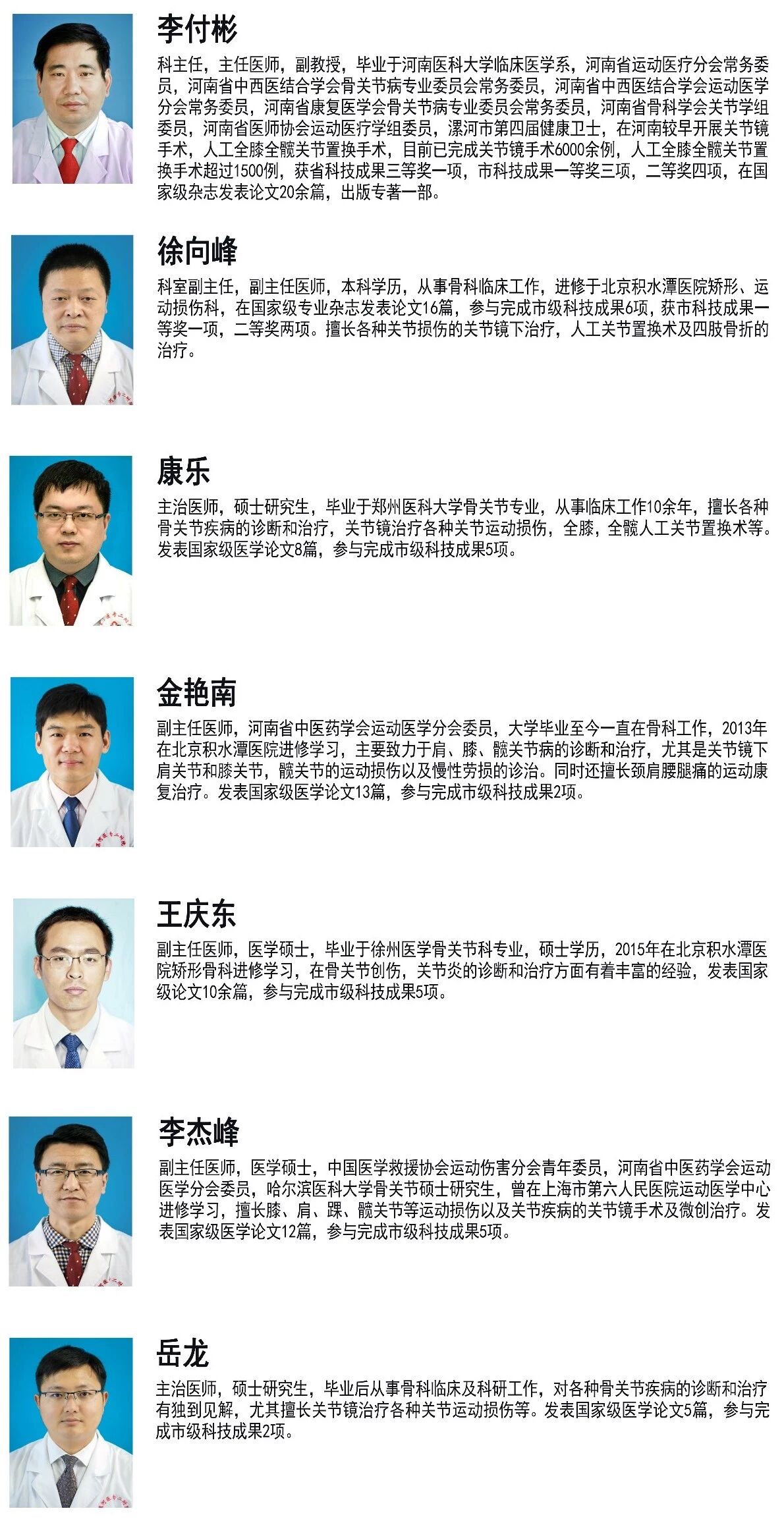 The department specializes in the diagnosis and treatment of joint diseases and sports injuries. It excels in the following procedures: arthroscopic treatment of meniscus injuries; arthroscopic treatment of osteoarthritis; total knee arthroplasty; total hip arthroplasty; revision surgery after artificial joint replacement; arthroscopic-assisted high tibial osteotomy for medial compartment knee osteoarthritis; arthroscopic reconstruction of anterior and posterior cruciate ligaments for their injuries; simultaneous arthroscopic reconstruction of anterior/posterior cruciate ligaments and posterolateral complex injuries; arthroscopic reconstruction of the patellofemoral ligament for recurrent patellar dislocation; as well as arthroscopic treatment of frozen shoulder, rotator cuff injuries and shoulder dislocation. It has also accumulated extensive experience in arthroscopic management of elbow, hip and ankle joint disorders. In addition, the department has established a comprehensive and distinctive system for postoperative nursing and rehabilitation training.Chief Physician Li Fubin, the director of the department, received further training at the Joint Disease Research Center of Peking University People's Hospital. He participated in the Artificial Joint Replacement Training Course at Queen Mary Hospital, The University of Hong Kong in 2009, and the Artificial Joint Replacement Workshop at Chang Gung Memorial Hospital, Taiwan in 2011. Since taking the lead in launching arthroscopic surgery in the southern Henan region in 1998, he has performed over 6,000 arthroscopic surgeries and more than 1,500 artificial joint replacement surgeries to date.