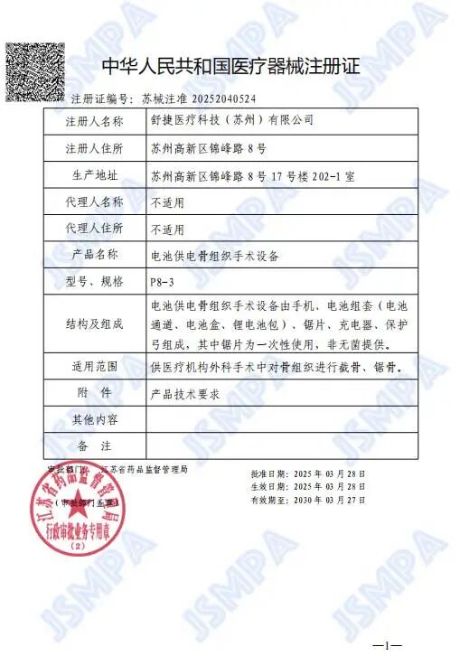 Shujie Medical, a wholly-owned subsidiary of Chunli Medical, has recently obtained marketing approval for its independently developed Battery-Powered Bone Tissue Surgical Device.