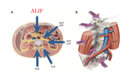 Traditional and Modified Approaches of ALIF.The traditional approaches for Anterior Lumbar Interbody Fusion (ALIF) include the midline transperitoneal approach and the anterolateral retroperitoneal approach. With the advancement of minimally invasive concepts, the traditional approaches have been modified into the mini-open anterior approach. A transverse incision (3-5 cm in length) is made slightly left of the abdominal midline at the corresponding vertebral level, which can be performed via either a transperitoneal or retroperitoneal route.