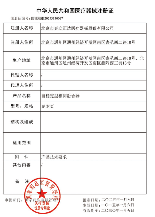 Beijing Chunlizhengda Medical Instruments Co., Ltd.'s "Self - Stabilizing Interbody Fusion Cage" has been approved for registration by the National Medical Products Administration (NMPA) of the People's Republic of China